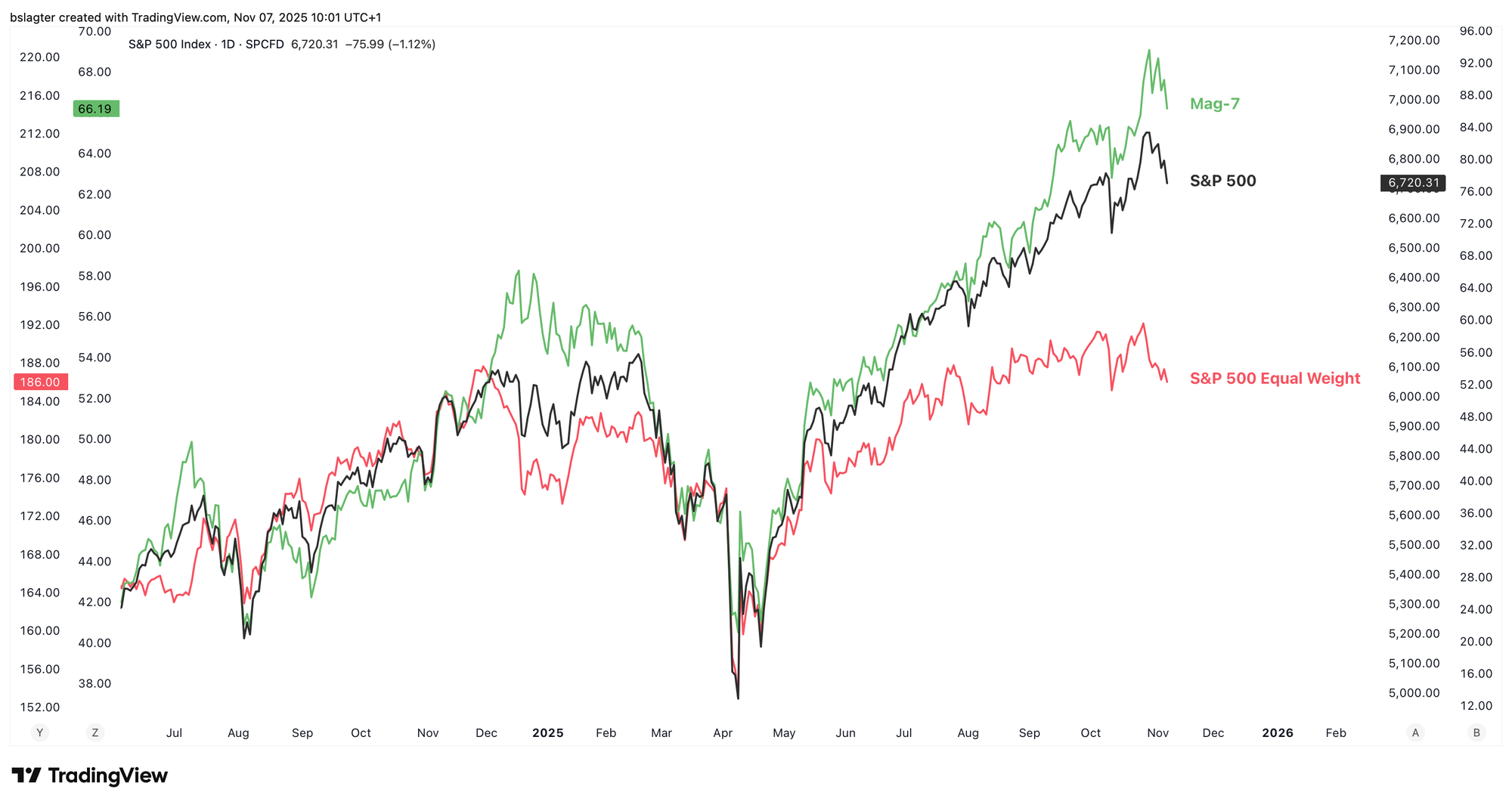 En dan hebben we nog hoogtevrees bij AI-aandelen. Die hebben de afgelopen maanden de kar getrokken. De S&P 500 Equal Weight Index, waarin elk bedrijf een gelijk aandeel van 0,2% heeft, ging de afgelopen maanden zijwaarts. En de market breadth van de S&P 500 ging zelfs omlaag.