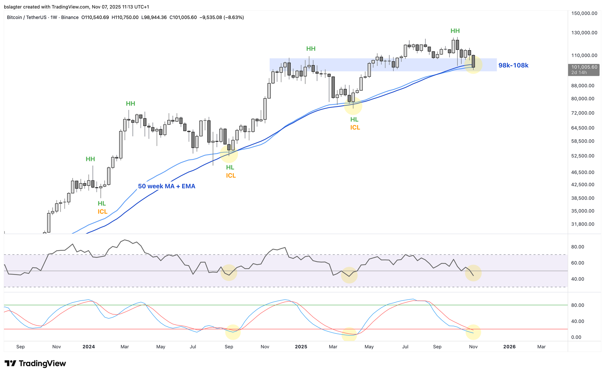 En in die context is bitcoin aangekomen op grofweg hetzelfde punt als 7 april 2025 en 6 september 2024. Dat waren meteen de laatste twee bodems op de weekgrafiek. De laatste twee weekly cycle lows (ICL).
