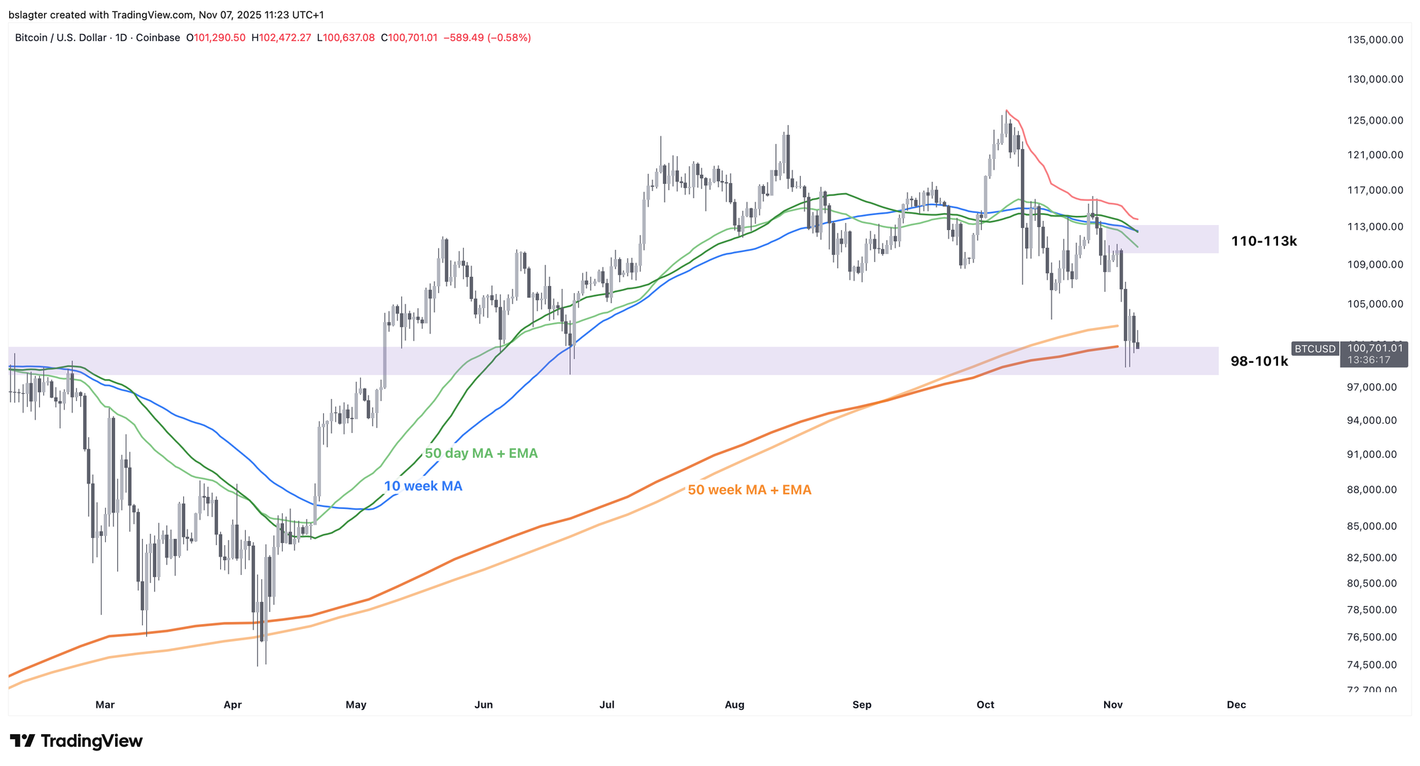 De situatie is deze bullmarkt nog niet zo benauwd geweest als nu. Op de bitcoingrafiek lijkt het erg op begin april, maar toen waren er duidelijk aanwijsbare externe schokken waarvan de impact op financiële markten alweer afnam. De handelsoorlog van Trump en de oorlog tussen Israël en Iran bijvoorbeeld.