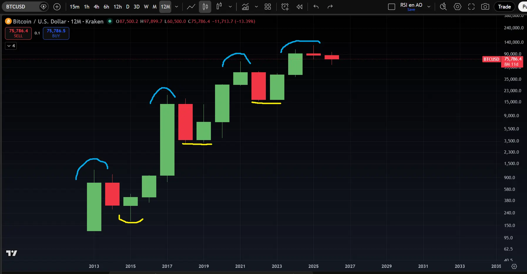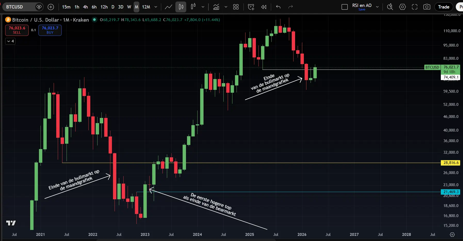 Als we het minimale prijsverschil van afgelopen oktober versus augustus 2025 buiten beschouwing laten, dan is in februari 2026 ook voor deze bearmarkt de eerste lagere bodem neergezet op de maandgrafiek. Ons basisscenario is nog altijd een milde bearmarkt met daarbij een verwachte bodem rond de 50.000 a 60.000 dollar. Mocht je een plan hebben gehad om te verkopen bij een maandslot onder de bodem van 74.000 dollar, dan zou je het leeuwendeel van de daling zomaar al kunnen hebben meegepikt. Dat klinkt verre van ideaal.