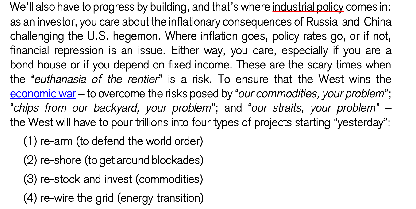 Dit versterkt de these van Zoltan Pozsar. In heel wat landen zullen gesprekken gevoerd worden over strategische voorraden, alternatieve bronnen van energie en grondstoffen, en de staat van het defensie-apparaat.