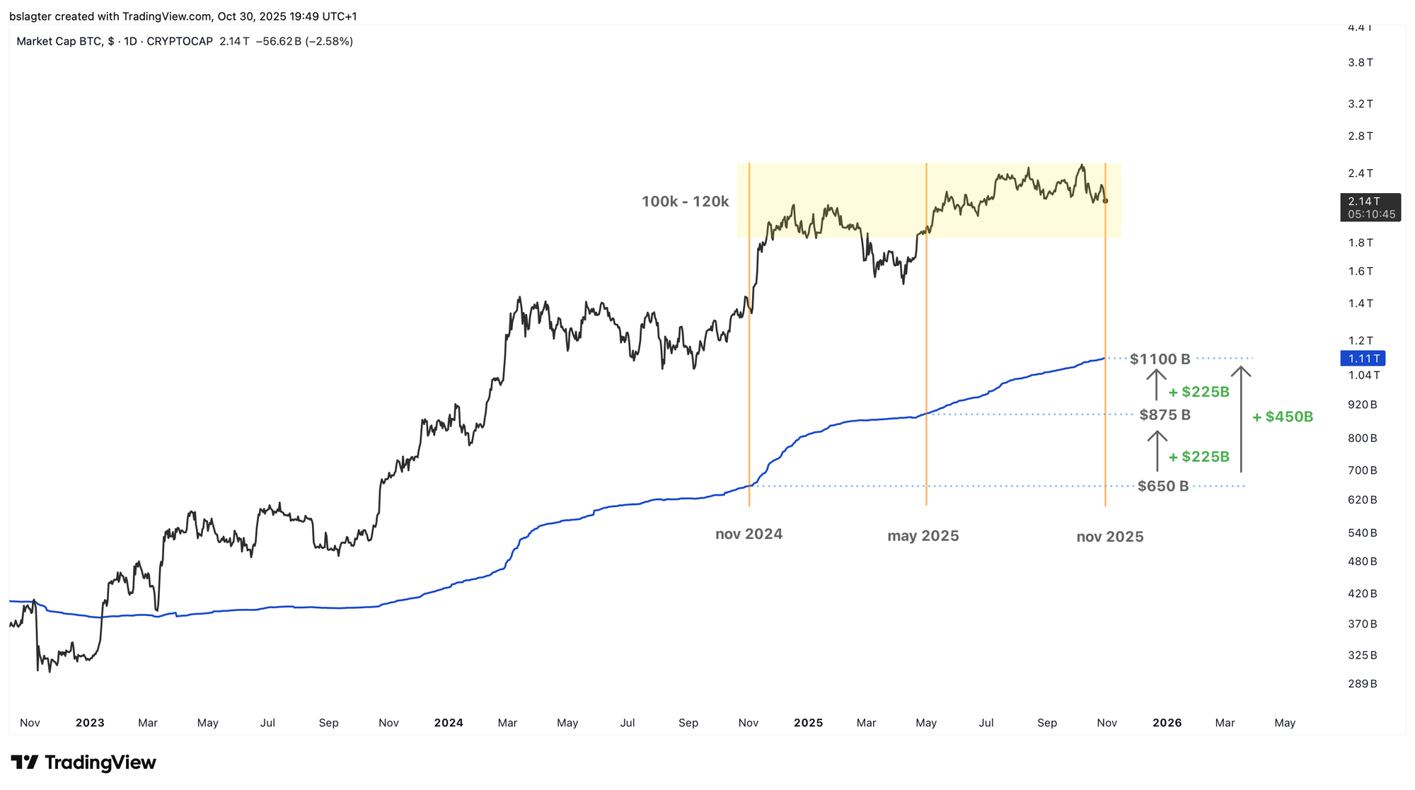 In de afgelopen twaalf maanden is er 450 miljard dollar naar bitcoin gestroomd, ongeveer 1,3 miljard dollar per dag. Terwijl de koers een groot deel van die periode tussen de 100.000 dollar en 120.000 dollar bleef steken, een teken dat vraag en aanbod in evenwicht waren.
