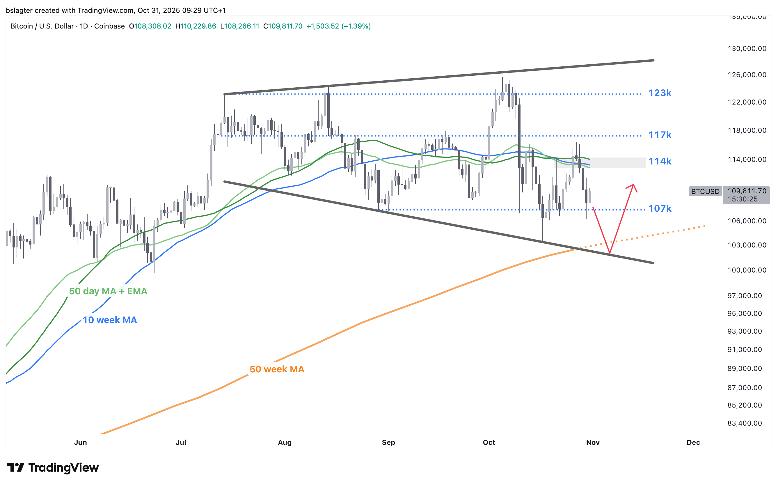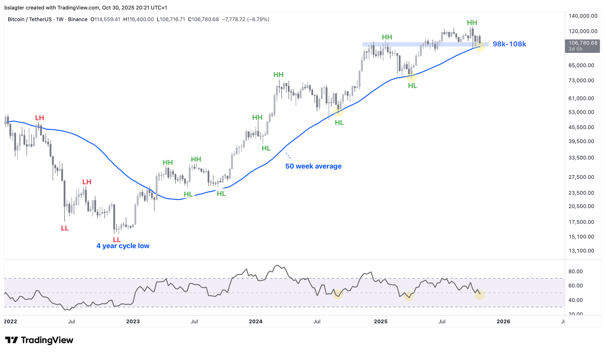We zijn aangekomen op een punt dat lijkt op augustus 2024 en april 2025, zie de grafiek hieronder. Vlak bij het 50-weekse gemiddelde en een RSI rond de 50. Ons basisscenario is dat de bullmarkt nog niet voorbij is, en dat we de komende weken een hogere bodem (HL) vormen rond de 100k.