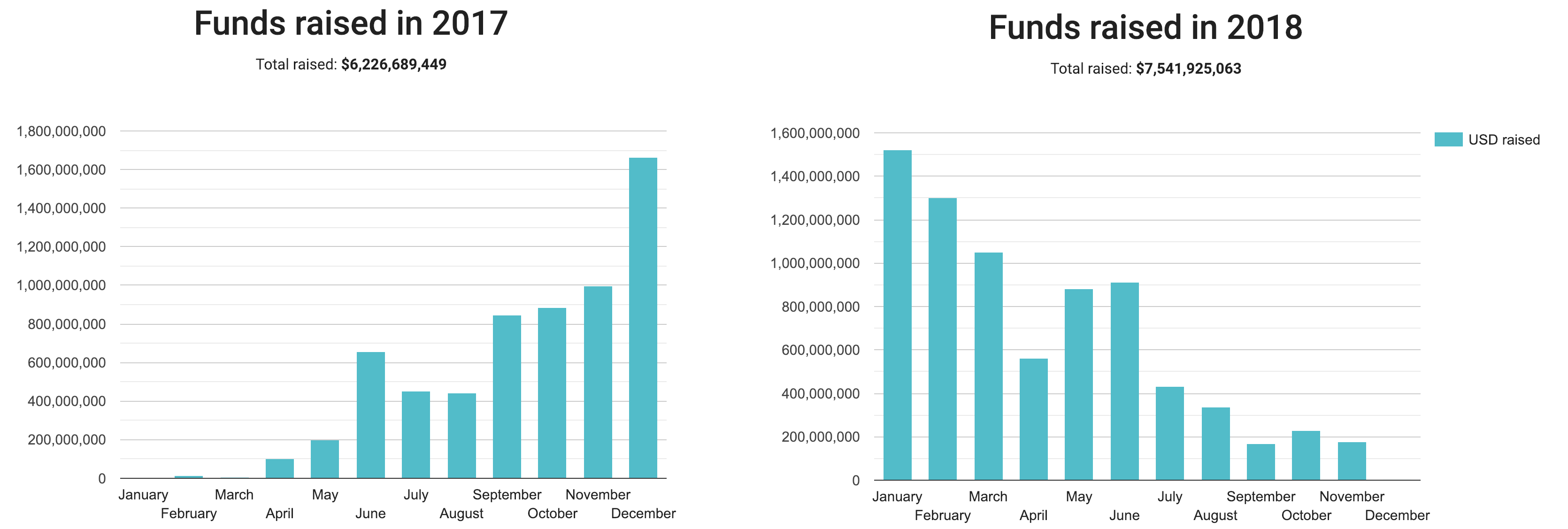 Een paar maanden later kwam de bullmarkt tot een hoogtepunt. Eén voor één tekenden de munten een spitse top in hun grafiek. Bitcoin op 20.000 dollar en ether op 1400 dollar. De twee maanden waarin het meeste geld werd opgehaald door initial coin offerings (ICO’s) waren december 2017 en januari 2018. Daarna ging het bergafwaarts.
