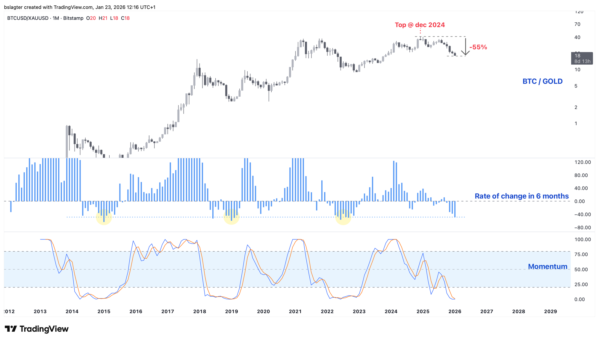 Als we de koers van bitcoin uitdrukken in goud in plaats van de dollar, dan krijgen we een beeld van hoe die twee ten opzichte van elkaar bewegen. De top van deze marktcyclus lag dan in december 2024, en we staan inmiddels op 55% verlies.