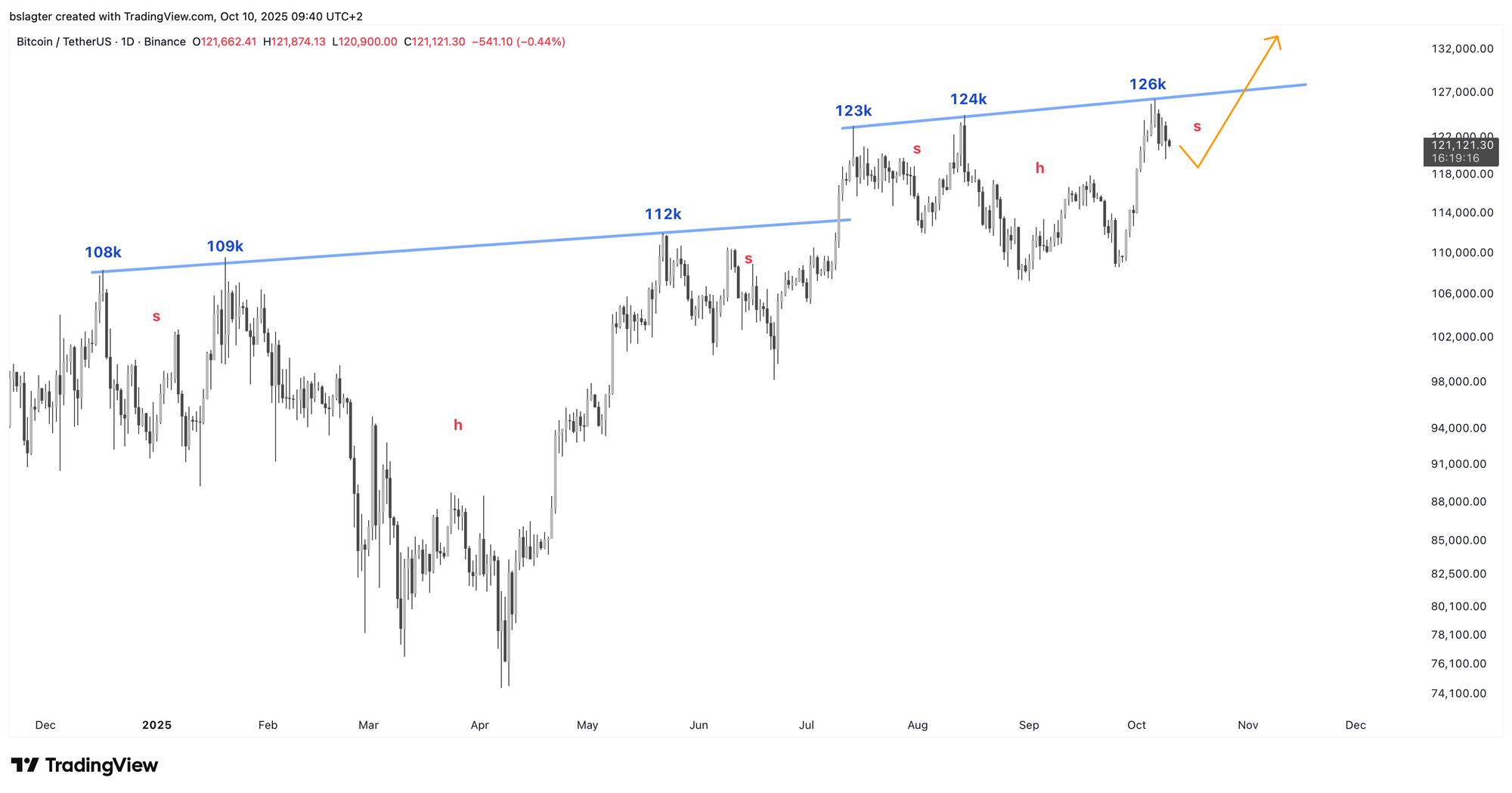 Een nieuwe all-time high voor bitcoin! Afgelopen maandag steeg de koers tot boven de 126.000 dollar en 106.000 euro, in beide valuta een record. Dit was de bekroning van een mooie rally vanaf de bodem op 26 september. In tien dagen steeg de koers met 16% van 108k naar 126k. De laatste zes dagen produceerden allemaal een groene candle.