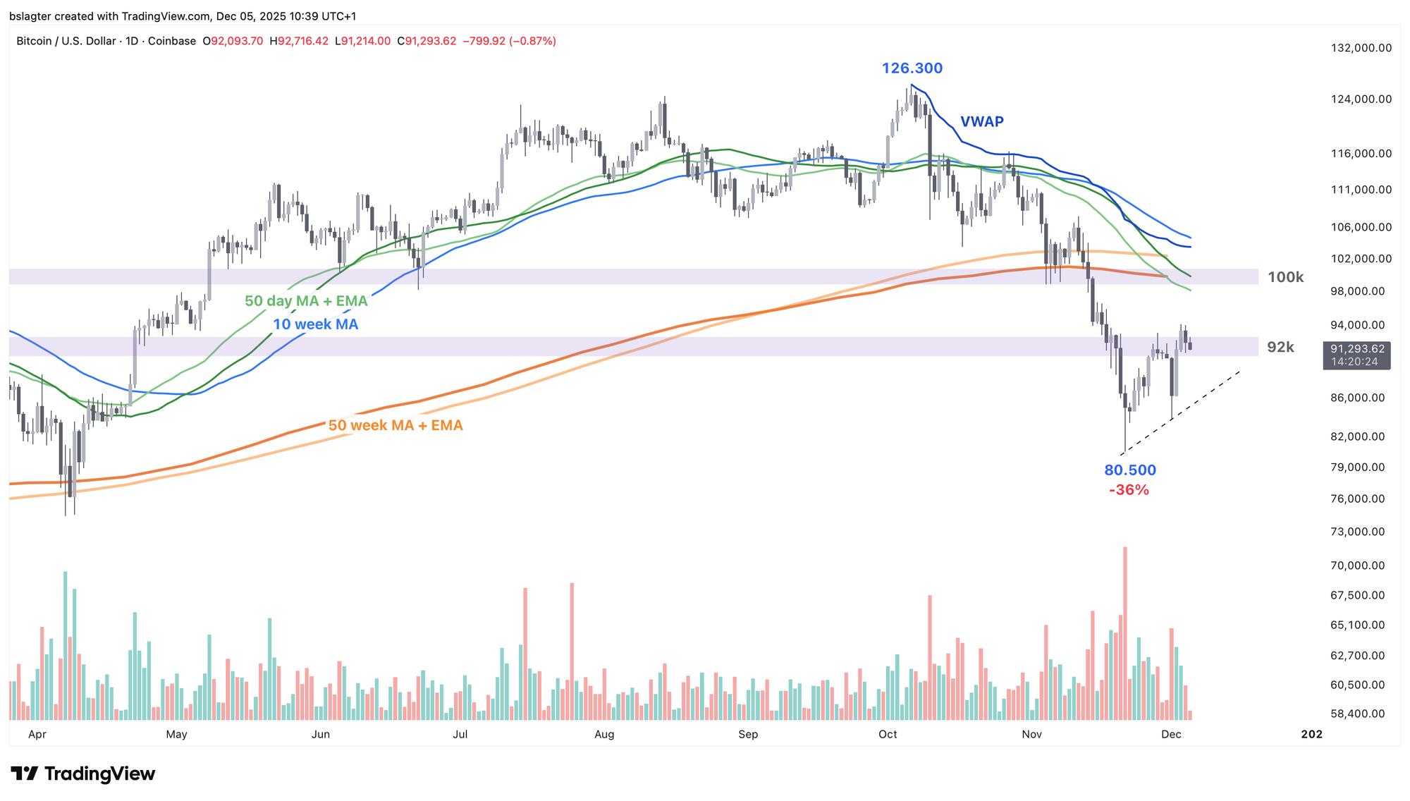 Vanuit het perspectief van cycle analyse is een weekslot boven het 10-weekse gemiddelde een sterke aanwijzing dat er een nieuwe weekly cycle begonnen is. Ook in bearmarkten komt een weekly cycle vrijwel altijd boven dat gemiddelde, ook al is het maar voor een paar weken. Dat gemiddelde ligt nu op 104.000 dollar, en daalt met ongeveer 2500 dollar per week.