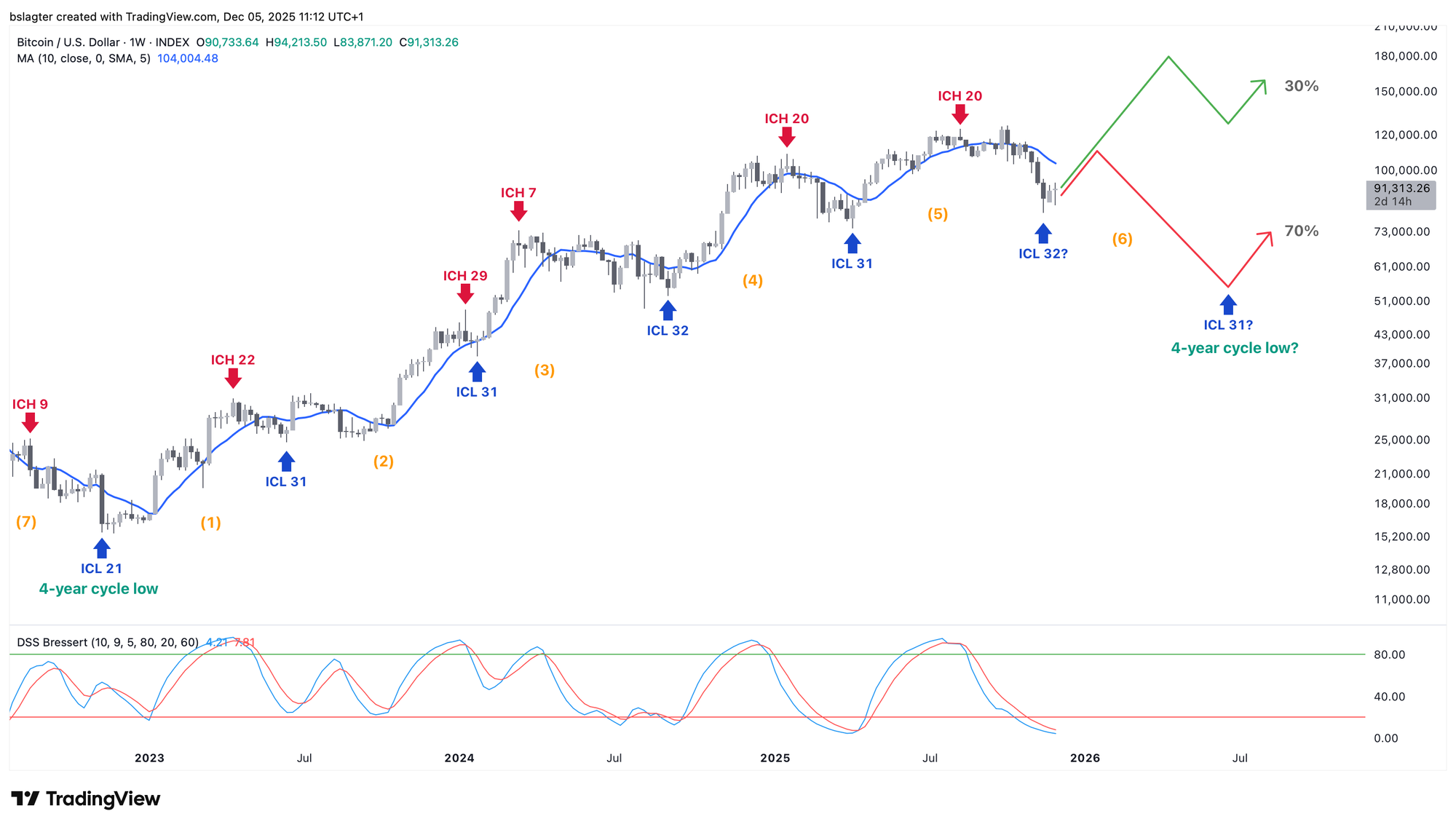 Laten we even aannemen dat 21 november inderdaad de weekly cycle low (ICL) was. Die viel dan in week 32, en dat is behoorlijk strak in het ritme van 31-32 weken. We zitten dan nu in de derde week van een nieuwe weekly cycle.